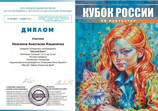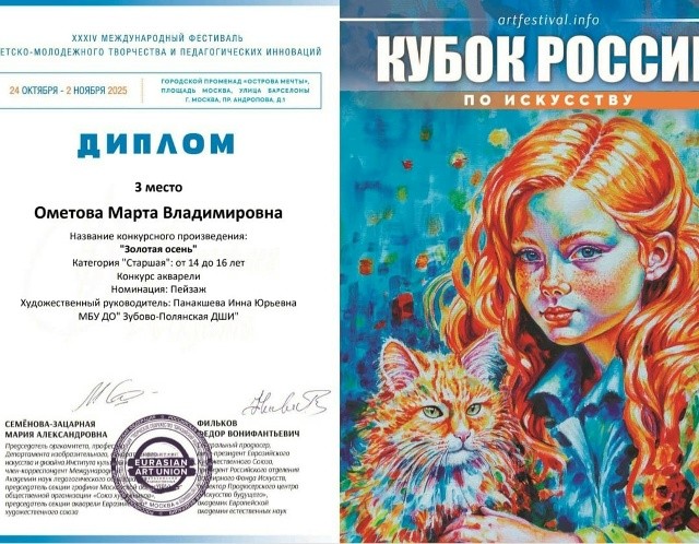 Обучающиеся отделения живописи Ометова Марта и Неяскина Анастасия (преподаватель: И. Ю. Панакшева) приняли участие в XXXIV Международном фестивале детско- молодежного творчества и педагогических инноваций     г. Москва ( 24.10. 2025г.- 02.11. 2025г.) Ометова Марта награждена Дипломом за III место    Неяскина Анастасия Дипломом за участие