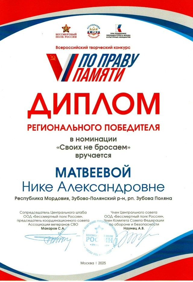 Наша ученица, Матвеева Ника, приняла участие во Всероссийском творческом конкурсе "По праву памяти."